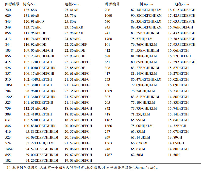 综合生长性状中的树高和地径的多重比较结果(表 4)可知,云南罗平种源(740)生长最快,树高达到135.68 cm以上,地径达到25.41 mm以上,其余3个生长快、生物量大的种源依次为:广西融安种源(629),树高达到131.69 cm以上,地径达到25.75 mm以上;贵州册亨种源(843),其树高达到120.91 cm以上,地径达到25.80 mm以上;湖南新宁种源(349),其树高达到123.72 cm以上,地径达到23.16 mm以上。生长最慢的为山东济南种源(1767),树高在62.50 cm以下,地径在11.50 mm以下。