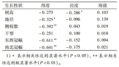 表 5 生长性状与地理因子的偏相关分析1) Table 5 Partial correlation analysis of growth traits and geographic factors |