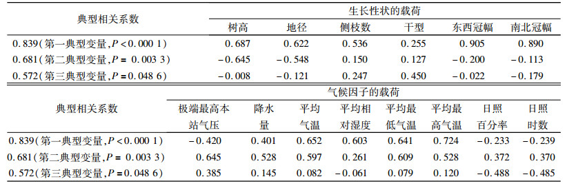 表 6 生长性状与气候因子的典型相关分析 Table 6 Canonical correlation analysis of growth traits and climatic factors |