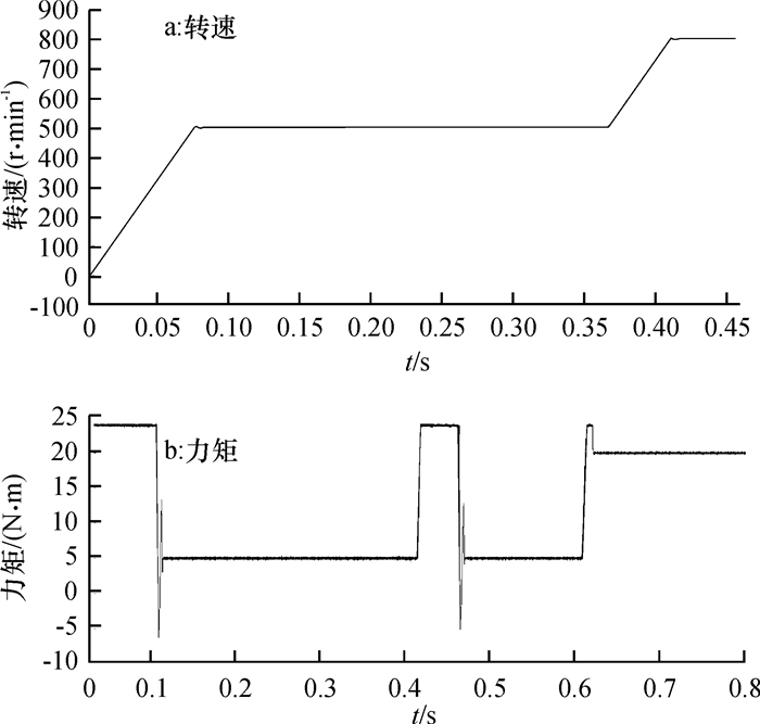 通过Switch开关切换到基于ID=0控制模式,得到此方式下的仿真曲线,在0.4 s速度给定由500 r·min-1变为800 r·min-1时,由于输出的给定电流饱和,故出现ID和IQ电流无法跟上的情况,同时电机的输出力矩也会变小,加速变缓慢。