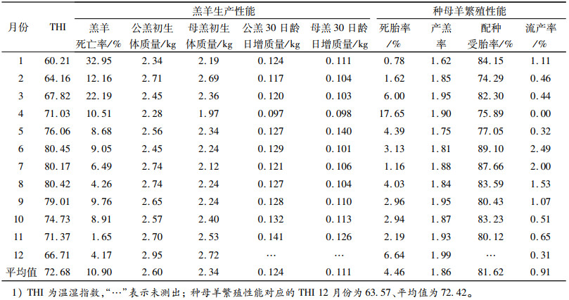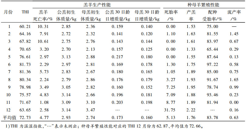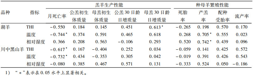 2.3 湖羊和川中黑山羊生长和繁殖性能与环境温湿度的相关性分析将湖羊及川中黑山羊的生长和繁殖性能与THI、温度及相对湿度进行相关性分析(表 3)。表 3结果显示:湖羊的羔羊死亡率与环境温度呈显著负相关(P < 0.05),湖羊母羔30日龄日增质量与THI呈显著正相关(P < 0.05);川中黑山羊的羔羊死亡率则与THI和环境温度呈显著负相关(P < 0.05),川中黑山羊的羔羊生长速度与环境温湿度没有明显的相关性;湖羊的产羔率与温度和相对湿度具有显著相关性(P < 0.05),而川中黑山羊的母羊繁殖率与环境温湿度没有明显的相关性。