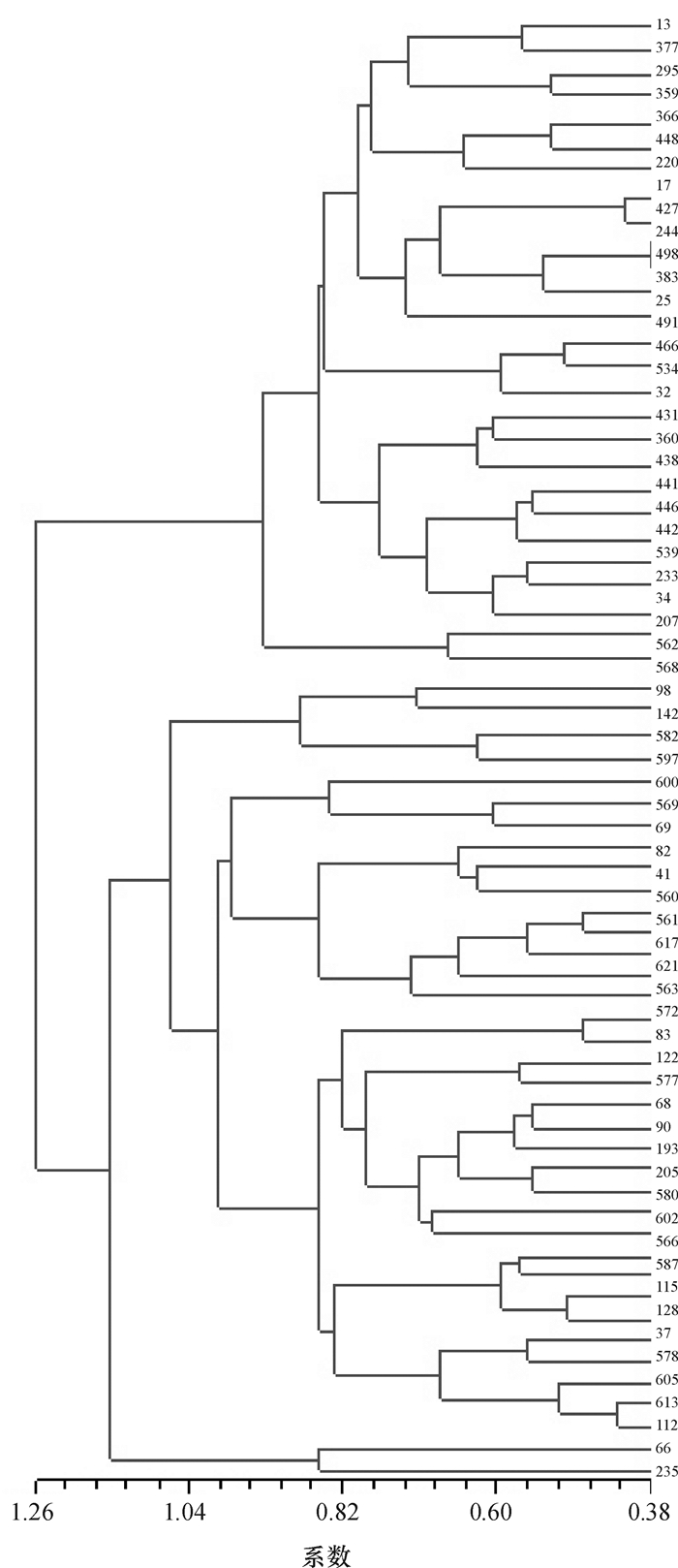 采取逐步聚类的方法,构建了10%和5%的核心样本,其遗传多样结果见表 4、聚类分析结果见图 2和图 3。从表 4和图 2可以看出,10%的核心样本材料间遗传距离较近,为0.38,其A能保持原始样本的92%以上,Ae、I、He和平均多态信息含量(PIC)等4个参数比原始样本的分别高3.70%、2.86%、3.22%和2.46%。图 3表明,5%核心样本的材料间遗传距离较远,达到了0.54,其A保持原始样本的89%以上,Ae和I比10%的核心样本有较大的下降,但仍分别比原始样本高2.12%和1.79%, He比原始样本高3.40%,比10%的核心样本也有所提高(表 4)。说明5%的核心样本所取材料间的位点重复性小,但仍能保持原始样本极高的遗传多样性。