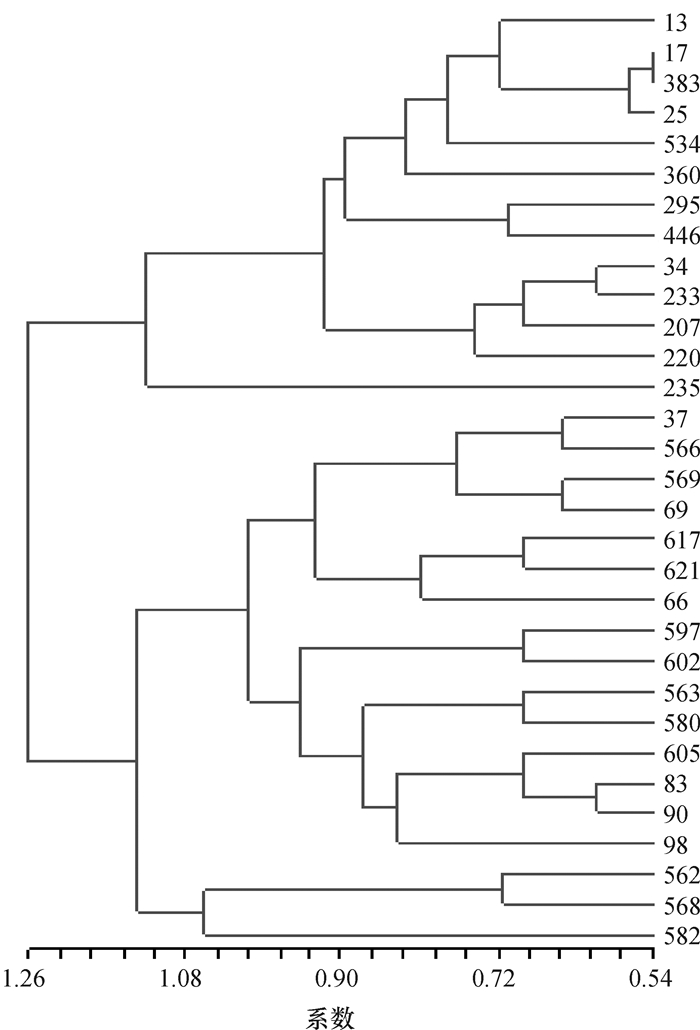 图 2 广西普通野生稻10%核心样本的UPGMA聚类图 Figure 2 UPGMA dendrograms of 10% core collections of common wild rice in Guangxi |