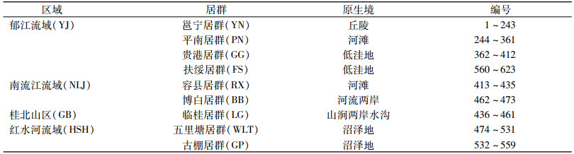 1 材料与方法 1.1 材料从郁江流域、红水河流域、南流江域和桂北山区的9个居群收集623份材料(表 1)。