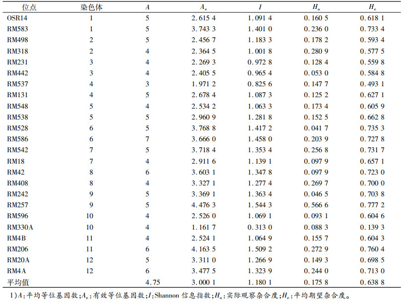 从水稻基因组SSR图谱中,挑选出均匀分布在水稻12条染色体上的且能扩增出多态性的24对引物(表 2)进行PCR分析。SSR标记引物由上海生工生物工程技术服务有限公司合成。
