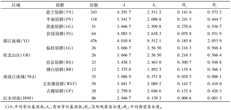 2.2 广西普通野生稻不同居群间遗传多样性比较9个居群的遗传多样性和地理分布见图 1和表 3。从图 1可以看出:邕宁、扶绥、贵港和平南属于郁江流域,临桂属于桂北山区,古棚和五里塘属于红水河流域,博白和容县属于南流江域。从表 3可以看出,9个普通野生稻居群的遗传多样性指数大小顺序为:邕宁居群(YN) > 临桂居群(LG) > 扶绥居群(FS) > 容县居群(RX) > 贵港居群(GG) > 平南居群(PN) > 古棚居群(GP) > 五里塘居群(WLT) > 博白居群(BB)。不同流域居群A的变化范围为2.946 7(HSH)~4.010 8(YJ),Ae的变化范围为0.139 3(HSH)~9.512 1(YJ),He的变化范围0.001 3(HSH)~2.053 9(YJ)。A最大的为郁江流域(YJ),最小的为红水河流域(HSH),表明郁江流域(YJ)是广西普通野生稻的遗传多样性中心(表 2)。