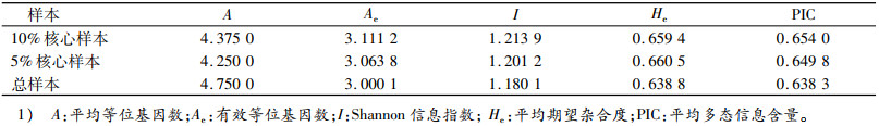 表 4 不同核心样本的遗传多样性比较1) Table 4 Comparisons of genetic diversities of different core samples |