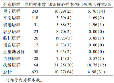 表 5 各居群占核心样本的比例1) Table 5 Ratios of core samples from each original populations |