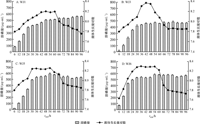 1.3 96 h细菌溶磷量与生长量的测定菌株WJ1、WJ3、WJ5和WJ6分别接种在LB培养基中,当培养液细胞浓度为D600 nm =0.6时,按体积分数为0.5%接种于100 mL改良NBRIP培养基。连续培养96 h,每隔6 h取样,标准板计数法测定细胞数量,钼蓝比色法测定溶磷量。