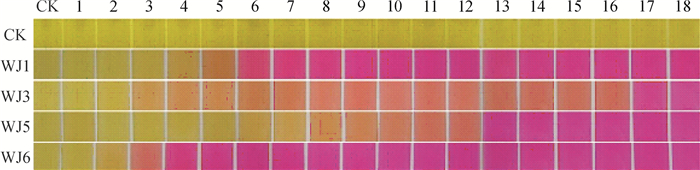 1.6 PSB菌株有机酸的提取为了测定不同PSB菌株产有机酸种类,将WJ1、WJ3、WJ5和WJ6种子液(同“1.3”)接种到改良NBRIP培养基中培养24 h后,培养液6 000 r·min-1离心15 min。上清液用0.22 μm滤膜真空抽滤,通过转酯作用对样品进行甲酯化反应[15]。每个样品取5 mL滤液与9 mL甲醇-硫酸(体积比=10: 7)混合,60℃培养12 h,待培养液冷却后离心分离,将5 mL甲醇加入到离心后的上清液中,上清液合并转移到60 mL分液漏斗中,再加入1 mL饱和NaCl溶液、20 mL蒸馏水、5 mL二氯甲烷进行洗涤,剧烈振荡60 s后静置分层。将脱水后的二氯甲烷相在40 ℃水浴条件下利用氮气吹干,然后准确加入1 mL二氯甲烷。以未接种的培养基作对照。样品进行GC-MS分析。