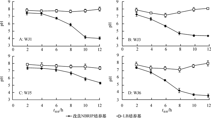 PSB在溶解磷酸盐过程中能够产酸[16-17]。虽然磷酸盐溶解的机理仍有许多不明之处,但已有报道称有机酸的释放导致的pH下降可能与溶磷作用相关[18]。甲基红试验表明:加入指示剂后,各菌株的培养物都观察到一致的颜色变化趋势(图 2):由黄色变为橙色,最后变为红色,但不同菌株菌液达到红色的时间明显不同。菌株WJ1、WJ3、WJ5、WJ6分别在4、3、8和2 h时开始变色,在6、17、13和4 h后保持红色不变。由图 3可知,在改良NBRIP培养基中,细菌的生长过程伴随明显的pH下降。在12 h内,菌株WJ1、WJ3、WJ6培养物的pH从开始的8降到3~5。12 h内相对应的LB液体培养基的pH略有下降,之后又恢复到最初的数值。菌株WJ5在LB培养基中培养,12 h内培养液pH略有下降,在改良NBRIP培养基中培养12 h后,与其他3株菌相比,培养液pH下降较小。