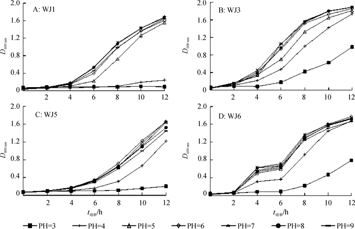 为了研究pH和细胞生长量之间的关系,在初始pH为3~9的LB培养基中对PSB的生长进行了观测。由图 4可知,各pH条件下,WJ1、WJ3、WJ5和WJ6的细胞生长趋势相似。培养基pH低于4时,各菌株生长量明显下降。pH为5的条件下,WJ1和WJ3的生长轻微减缓,而WJ5和WJ6仍正常生长。
