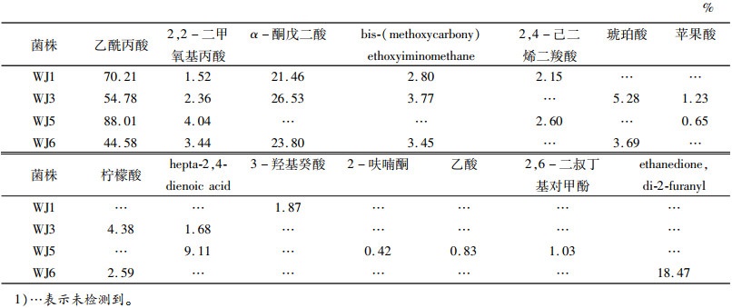 对4菌株24 h培养物中的有机化合物进行GC-MS分析。表 1显示,WJ1、WJ3、WJ5、WJ6菌株的培养滤液中分别检测到6、8、8和7种有机化合物,这些有机化合物中包含了不同种类的有机酸。其中,乙酰丙酸的相对含量最高,但其是对照中检测到的仅有的有机酸成分,因而不能认定乙酰丙酸为PSB菌株溶磷过程中产生的。2,2-二甲氧基丙酸是4种菌株培养滤液中另一种共有的成分,相对于检测到的化合物总量所占百分比分别为:1.52%、2.36%、4.04%和3.44%。WJ1、WJ3、WJ6培养滤液中α-酮戊二酸的相对含量较高,分别达到21.46%、26.53%和23.80%。此外,WJ3与WJ6还检测到3种相同的物质,包括bis- (methoxycarbony) ethoxyiminomethane、琥珀酸、柠檬酸。