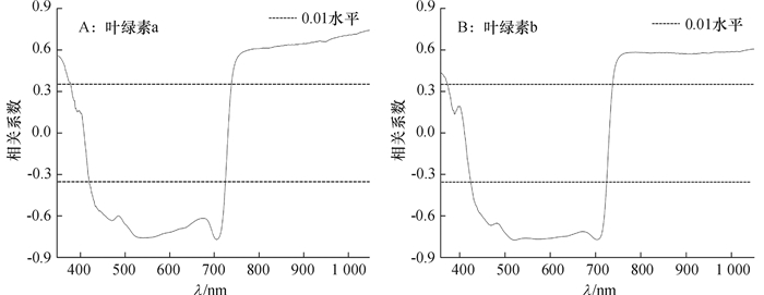 2 结果与分析 2.1 叶绿素含量与光谱反射率的相关性将马铃薯叶片叶绿素a、b含量与相对应的54组叶片光谱反射率进行相关性分析。由图 1可以看出叶绿素a、b含量与原始光谱反射率除在410~730 nm处呈现负相关关系外,其他波段均呈现正相关关系。叶绿素a含量与原始光谱反射率分别在420~725、738~1 050 nm处呈极显著相关(P < 0.01),在420~725 nm处呈极显著负相关,而在738~1 050 nm处呈极显著正相关。叶绿素b含量与原始光谱反射率分别在422~724、737~1 050 nm处呈极显著相关,在422~722 nm处呈极显著负相关,而在737~1 050 nm处呈极显著正相关。叶绿素a、b含量分别在704、519 nm处与原始光谱反射率相关程度最高,其值分别为-0.77、-0.78。分析叶绿素含量与原始光谱反射率的相关性,确定马铃薯叶片叶绿素含量敏感波段为400~800 nm。