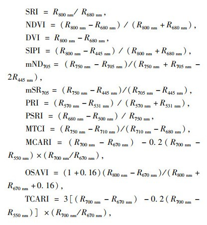 1.4 光谱植被指数的选取光谱植被指数是某些光谱波段反射值的特定组合。本文选取前人研究中与叶绿素含量有关的12个植被指数:简单比值指数(SRI)、归一化植被指数(NDVI)、差值植被指数(DVI)、结构不敏感色素指数(SIPI)、修正归一化差异指数(mND705)、修正简单比值指数(mSR705)、光化学植被指数(PRI)、植被衰减指数(PSRI)、地面叶绿素指数(MTCI)、修改叶绿素吸收反射指数(MCARI)、优化土壤调节植被指数(OSAVI)和转化叶绿素吸收反射指数(TCARI)[14-18]。各植被指数的计算公式如下:
