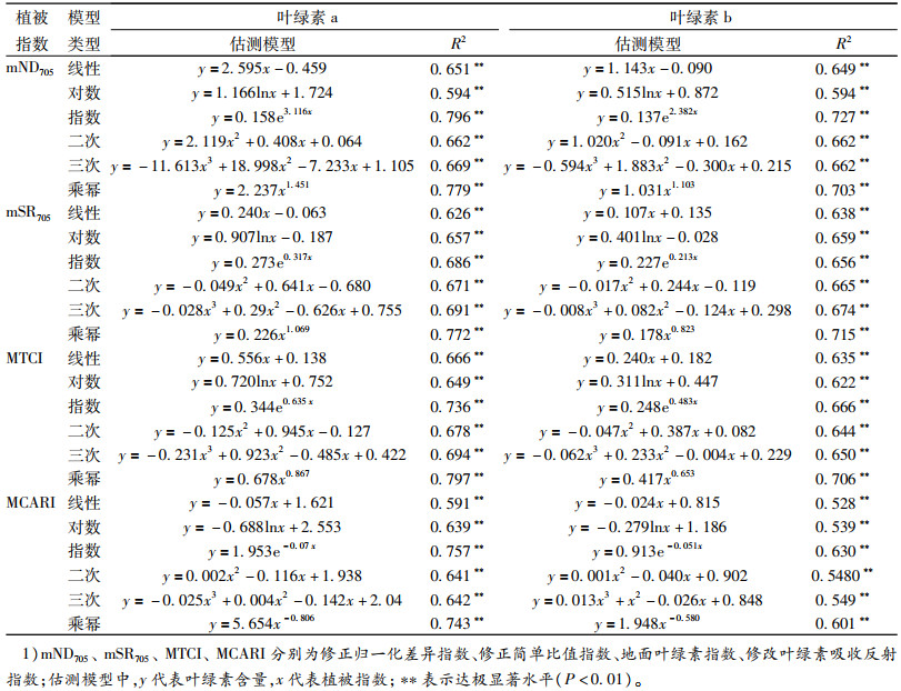 mND705、mSR705、MTCI、MCARI所建立的预测叶绿素b含量的线性、对数、指数、二次、三次、乘幂模型的R2较高,均达到极显著水平,可以用于马铃薯叶片的叶绿素b含量估测(表 1)。mND705构建的指数模型估测叶绿素b含量的R2最高,为0.727;其次是mSR705构建的乘幂模型,R2为0.715。