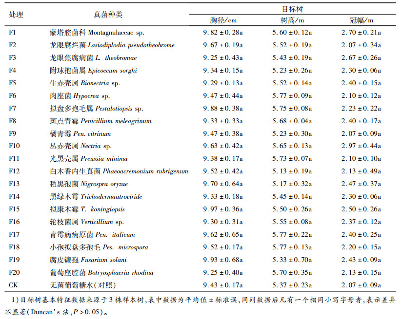 1 材料与方法 1.1 试验材料与试验地概况试验材料为广东种源的7年生白木香,试验地位于广东省惠州市惠东县白盆珠镇莲花山,为花岗岩地质;南亚热带季风气候,年均气温22.0 ℃,年均日照2 038.9 h,≥10 ℃年积温7 947.9 ℃;年均降雨量1 935.7 mm;年均相对湿度80%,年蒸发量1 875 mm,常年基本无霜;土壤为山地红壤。不同真菌分离自已结香的白木香树体、树桩和根系,从分离的54株不同种菌株中,选择20种具有代表性或有研究表明其对结香有效的菌种,且涵盖几乎所有已报道的菌种(表 1)。目标树胸径约为9~10 cm,树高和冠幅无显著差异(表 1),有利于不同真菌对白木香树体结香促进作用大小的检测。
