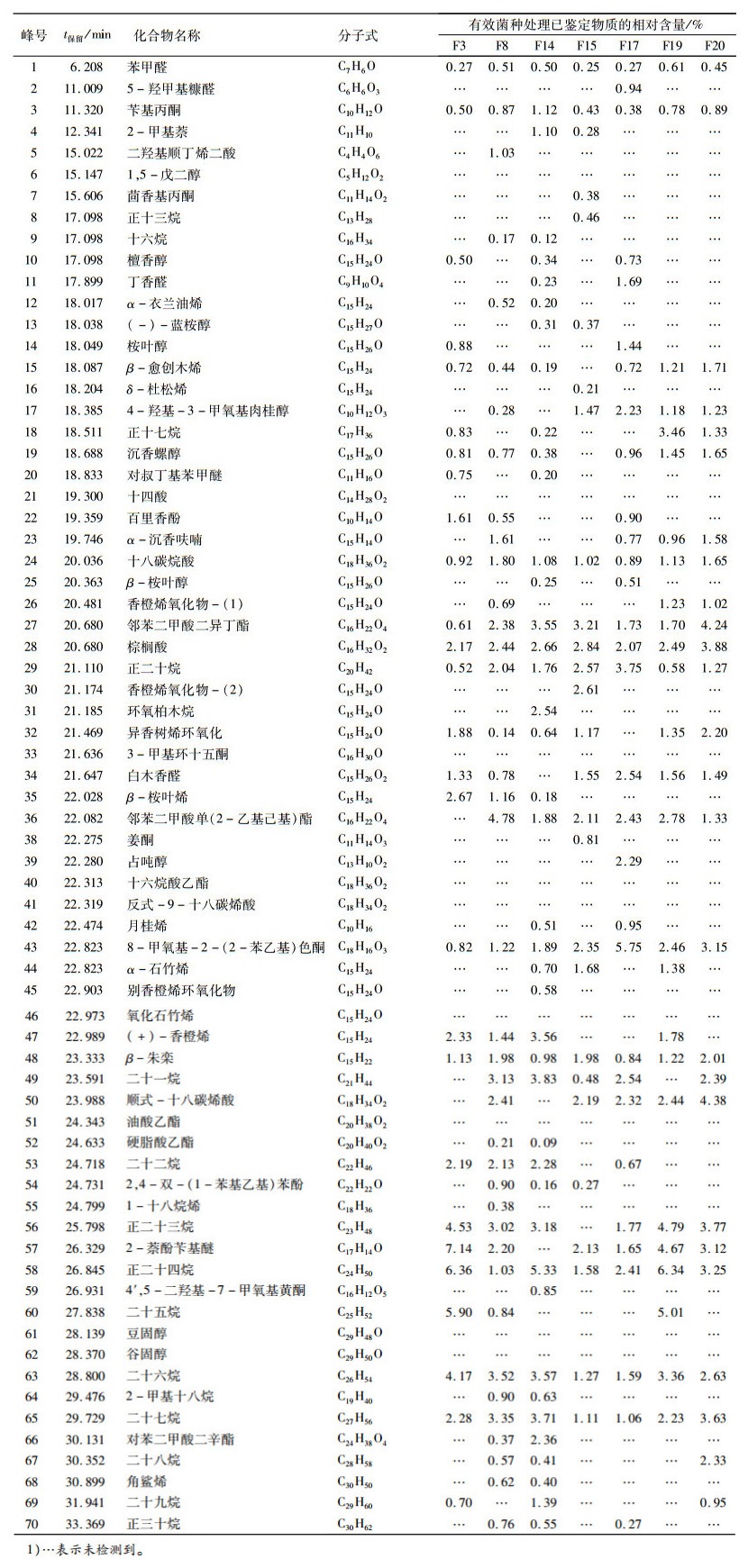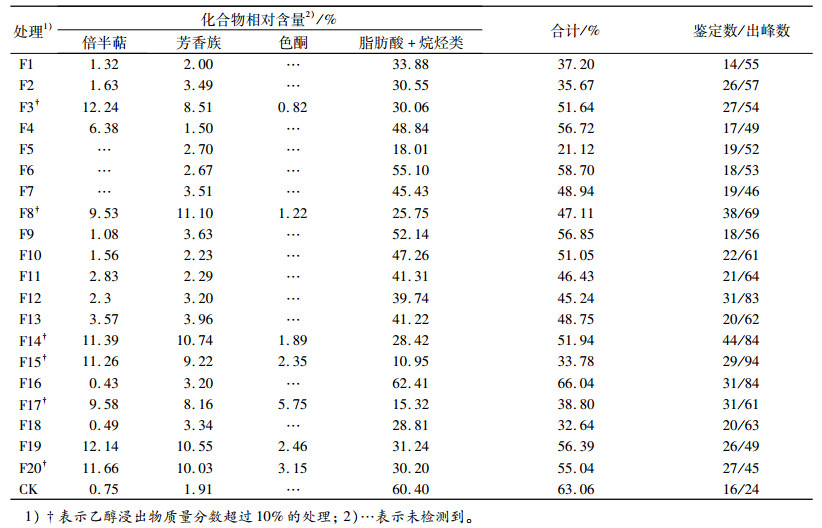 2.2 不同真菌对白木香树体挥发油化学成分的影响7种有效促进白木香物质形成的真菌处理,其所侵染木质部挥发油成分如表 2所示,乙醇浸出物质量分数大于10%的7种有效真菌处理,其检出物中共含有倍半萜化合物21种,芳香族化合物12种,色酮化合物1种,脂肪酸和烷烃类及其他化合物36种。这7种有效真菌处理,都含有的化学成分包括:苯甲醛、苄基丙酮以及十八碳烷酸、邻苯二甲酸二异丁酯、棕榈酸、正二十烷、8-甲氧基-2-(2-苯乙基)色酮、正二十四烷、二十六烷、二十七烷。其中小分子苯甲醛和苄基丙酮可能是其他倍半萜、芳香族和色酮物质的前体物质,有效真菌F3、F8、F14、F15、F17、F19和F20侵染树体所得2-(2-苯乙基)色酮类物质相对含量分别为0.82%、1.22%、1.89%、2.35%、5.75%、2.46%和3.15%。