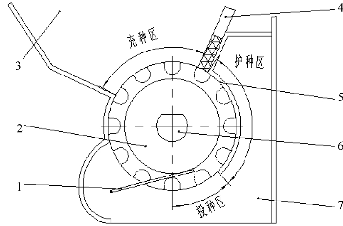 图 1 排种器结构图 Figure 1 Structure diagram of the seeding apparatus 1:清种器;2:窝眼轮;3:种箱;4:毛刷;5:护种板;6:排种轴;7:壳体。 |