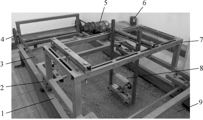 图 2 土槽试验台结构图 Figure 2 Structure diagram of the soil bin test bed 1:轨道;2:轨道轮;3:链条;4:链轮;5:三相异步电动机;6:变频调速器;7:台架;8:排种器;9:土壤。 |