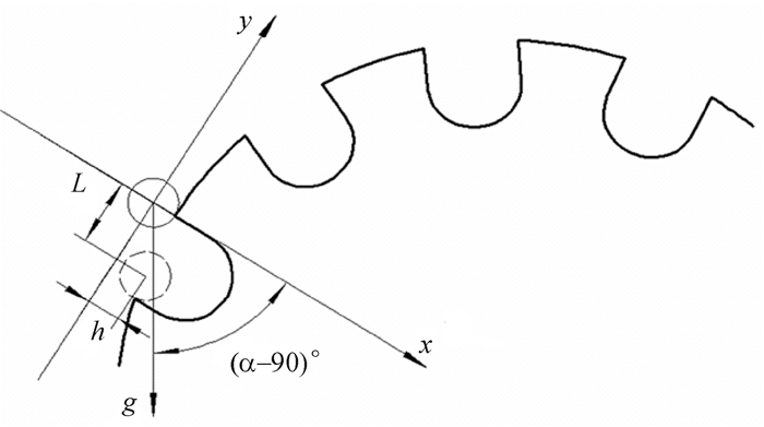 2.2.3 窝眼轮转速因素水平的选取窝眼轮转速是影响排种器充种质量的重要因素之一,与作业速度成正比。排种轴转速增加时,种子向型孔内充填的时间随之减少,机率随之减小,同时型孔壁与种子的力学作用过程复杂化。排种轴的转速增加不利于排种器高质量完成各项工作环节,主要表现为漏播[17]。如图 3所示,假设种子不受种群的作用力,种子沿窝眼轮运动,窝眼轮静止。