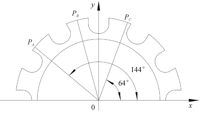 图 4 排种器充种角度(α)示意图 Figure 4 Schematic diagram of seed-filling angle PA、PB、PC分别表示充种起始角、任意角和终止角。 |