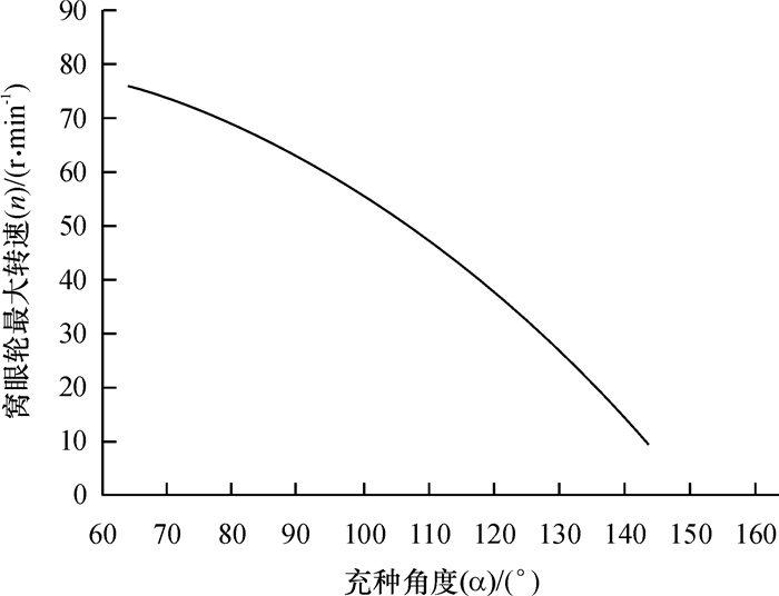 在该排种器中,充种角度α的范围如图 4所示,充种起始角PA为144°,充种终止角PC为64°,PB为充种起始角PA和充种终止角PC间的任意角。忽略种子初始速度v0,窝眼轮转速随充种角度的变化趋势如图 5所示。