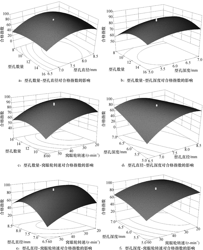 3.2 响应曲面分析型孔数量、型孔直径、型孔深度和窝眼轮转速的交互作用对合格指数影响显著。任意固定其中2个因素的水平,根据响应曲面图,分析其余2个因素的交互作用对合格指数的影响,结果见图 6。
