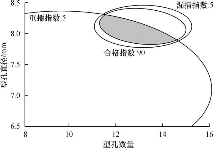 图 7为型孔深度5.5 mm,窝眼轮转速35 r·min-1时,型孔数量与型孔直径都处于最佳值的区域图,其中灰色重叠区域为参数优化区域,即型孔数量11~15,型孔直径在7.8~8.2 mm时,合格指数大于90,重播指数和漏播指数均小于5。