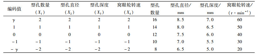 考虑到三七的种植环境及播种机的作业方式,取播种机的作业速度V=0.4 m·s-1,窝眼轮转速n取中心点的窝眼轮转速,即n=40 r·min-1,根据三七的种植农艺要求,株距确定为50 mm,则型孔数量为12,将中心点的型孔数量确定为12,步长为2,其他水平的型孔数为8、10、14和16。因素水平编码如表 1所示。