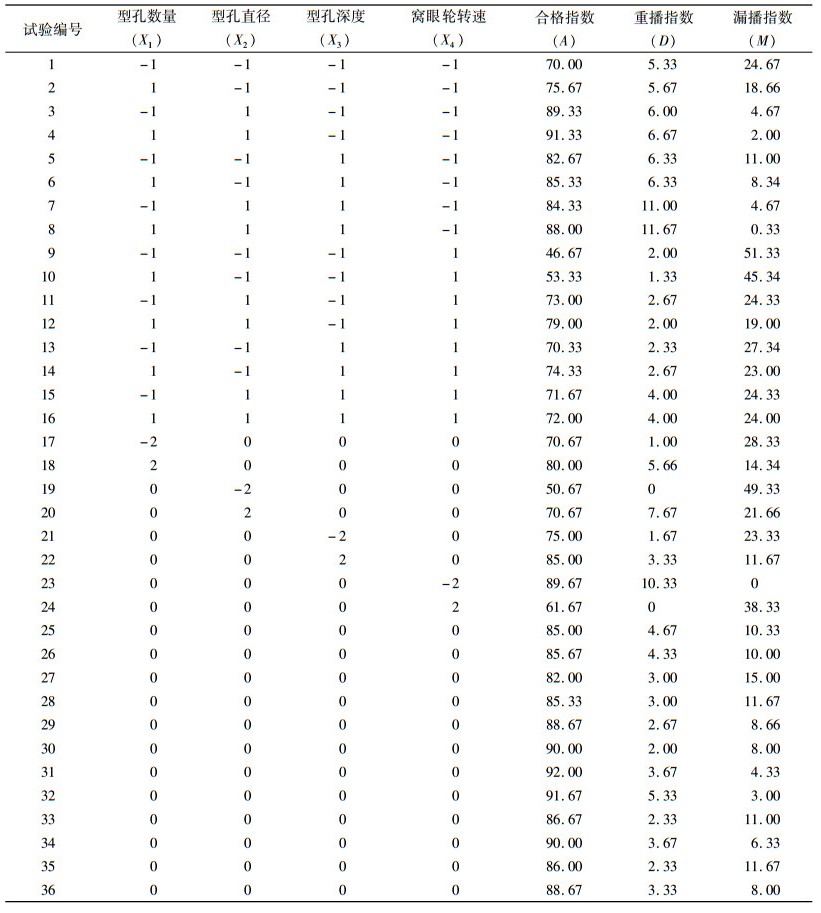 选取排种器的型孔数量、型孔直径、型孔深度和窝眼轮转速4个因素按照二次正交旋转组合设计进行试验,利用自制土槽试验台测试各试验组的排种合格指数、重播指数和漏播指数,试验结果见表 2。