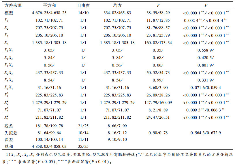 回归模型的显著性检验和方差分析见表 3。由表 3可知,该模型的拟合度极显著(P < 0.01)。但型孔数量和型孔尺寸交互项(X1X2)的P值、型孔数量和型孔深度交互项(X1X3)的P值、型孔数量和窝眼轮转速交互项(X1X4)的P值以及型孔尺寸和窝眼轮转速交互项(X2X4)的P值均大于0.1,说明型孔数量和型孔尺寸交互项、型孔数量和型孔深度交互项、型孔数量和窝眼轮转速交互项以及型孔尺寸和窝眼轮转速交互项对合格指数的影响不显著,其他各项的F检验均非常显著,说明相关试验因素对响应值的影响存在二次关系。对于失拟项P=0.564 3>0.05,差异不显著,说明不存在其他影响指标的主要因素。剔除不显著因素后的回归模型如下: