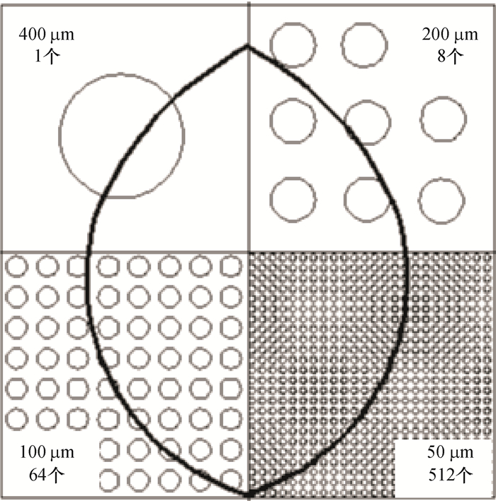 2 农药喷雾最佳粒径 2.1 雾滴尺寸与农药防治效果喷雾效果的好坏,与雾滴粒径的大小、雾滴的漂移及雾滴的沉降速度等因素有密切关系,雾滴粒径是农药喷雾技术中较易控制的重要参数,对喷雾效果起着决定性作用[26-27]。选用适宜的雾滴粒径是用最少药量取得最好药效并减少环境污染的技术关键。雾滴粒径与雾滴覆盖密度、喷液量有密切关系,如图 3所示,1个400 μm的粗大雾滴,变为200 μm的中等雾滴后,就变为了8个雾滴;雾滴粒径缩小到100 μm的细小雾滴后,就变64个雾滴。雾滴数量与雾滴粒径的变化关系为:n=6V/(πr3),式中,n为雾滴数量,r为雾滴粒径,V为药液量。可见,随着雾滴粒径的缩小,雾滴数目呈几何速度增加,随着雾滴数量的增加,农药击中靶标的概率显著增加,覆盖也更加均匀。