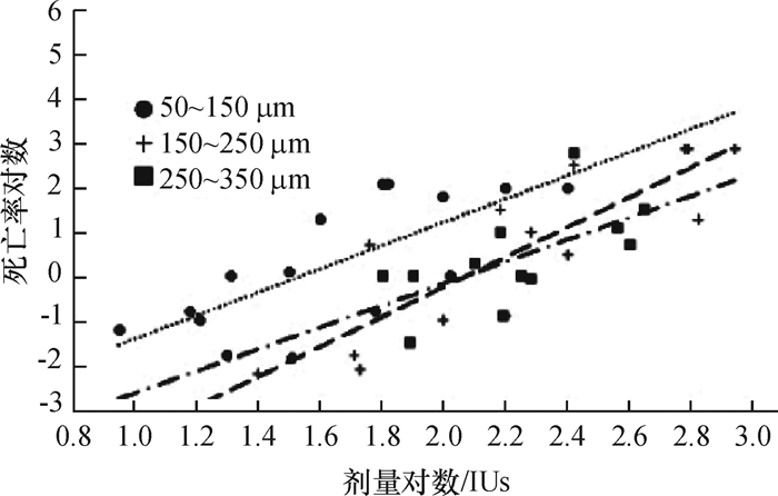 2.2.3 生物最佳粒径与防治效果Bryant等[37]研究了苏云金芽孢杆菌雾滴粒径以及雾滴密度对舞毒蛾幼虫防治效果的影响,结果表明,相对于喷施体积中径≥150 μm的雾滴,喷施更低剂量的50~150 μm的雾滴,对舞毒蛾具有相同的杀伤效果;致死剂量与雾滴粒径之间具有线性回归关系:LD50=1.241+0.461×雾滴体积中径,随着雾滴中径的减小,LD50也会随之减小,即小雾滴更有利于对舞毒蛾的防治。不同雾滴粒径条件下,剂量对数与死亡率对数之间的关系见图 4。对舞毒蛾2、3龄幼虫,雾滴粒径为100 μm、雾滴密度为5和10个·cm-2时、死亡率大于90%;对4龄幼虫,雾滴粒径为200和300 μm时,防治效果较粒径100 μm的更为显著;当雾滴密度为1个·cm-2、雾滴粒径为100 μm时,对于控制3、4龄幼虫是无效的。袁会珠等[38]的研究也表明,最佳喷雾粒径不仅随害虫种类而变化,也会因病虫害的不同时期而异。