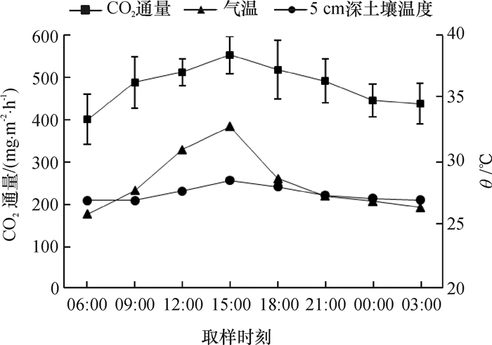 3 结果与分析 3.1 土壤CO2、CH4、N2O通量日变化特征由图 1可知,CO2的全天通量均为正值,说明马占相思人工林土壤为CO2的排放源。CO2排放通量的日变化具有一定的规律性,总体表现为先增高后降低的单峰曲线。整体来看CO2排放通量的日变化比较平稳,白天稍高于晚上,变化幅度为401.33~555.59 mg·m-2·h-1,日均值482.68 mg·m-2·h-1。土壤CO2排放通量的最小值出现在06:00左右,此时土壤温度最低。此后,随着温度的升高,CO2排放通量也随之升高,在15:00左右达到全天的峰值。相关性分析表明,土壤CO2排放通量与地表气温及5 cm深土壤温度之间有显著的正相关性(Rθa=0.748,P < 0.05;Rθs=0.846,P < 0.01;Rθa为通量与地表气温的相关系数,Rθs为通量与5 cm深土壤温度的相关系数,下同)。