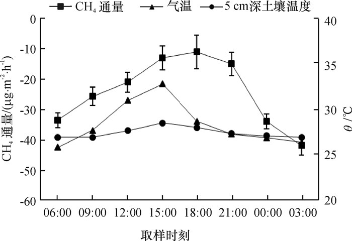 由图 2可知,全天的CH4通量均为负值,说明马占相思人工林土壤为CH4的吸收汇。CH4吸收通量呈现明显的单峰变化,夜间吸收通量明显高于白天,变化范围为-10.96~-41.88 μg·m-2·h-1,日均值为-24.35 μg·m-2·h-1。从早上开始CH4的吸收量不断减小,于下午18:00左右CH4的吸收通量达到最小值,为-10.96 μg·m-2·h-1,太阳落山之后急剧增加,凌晨03:00达到全天吸收的最大值,为-41.88 μg·m-2·h-1,最大吸收通量是最小值的3.8倍。相关性分析发现,气温对土壤CH4通量无显著影响(P > 0.05),土壤CH4通量与土壤5 cm温度之间有显著的相关性(Rθs=0.797,P < 0.05)。