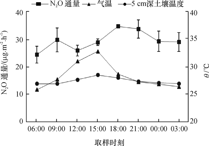 由图 3可知,全天的N2O通量均为正值,说明马占相思人工林土壤为N2O的排放源。N2O排放通量变化范围有较明显的日变化特征,呈现升高-降低-升高-降低的趋势,呈大小不同的双峰曲线,变化范围24.50 ~ 34.72 μg·m-2·h-1,日均值为29.51 μg·m-2·h-1。N2O排放通量的最低点出现在早上06:00,这很可能是由于早上的低温所致;随后N2O排放通量逐渐增强,在09:00左右达到第1个峰值;此后排放通量呈下降趋势,在12:00时出现低谷;12:00之后排放通量迅速增加,在18:00达到全天的峰值,34.72 μg·m-2·h-1。相关性分析发现,地表气温及5 cm深土壤温度对土壤N2O排放通量无显著影响(P > 0.05)。