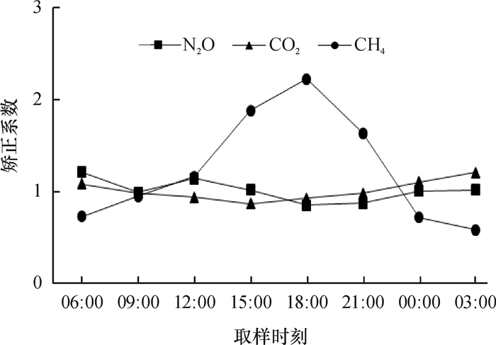 图 4 土壤CO2、CH4和N2O通量的矫正系数随时间的分布 Figure 4 Diurnal changes of correction coeffients of CO2, CH4 and N2O fluxes from soil |