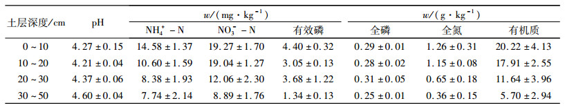 2.3 土壤样品的采集及分析在标准地内选择3处有代表性的地段挖掘土壤坡面,划分4个层次(0~10、10~20、20~30、30~50 cm),分层采集土壤样品,带回实验室分析。土、水按质量比1.0:2.5配成溶液,pH计测定土壤pH;用靛酚蓝比色法测定NH4+-N;用镀铜镉还原-重氮化偶比色法测定NO3--N;用重铬酸钾氧化-外加热法测定有机质;用半微量凯氏法测定全氮;用氢氧化钠碱熔法将土壤样品溶融后提取待测液,用钼蓝比色法测全磷;用0.5 mol·L-1的碳酸氢钠提取土壤样品后,用钼蓝比色法测速效磷[18]。