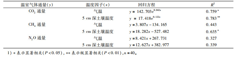 表 2 土壤CO2、CH4和N2O通量与温度的相关性1) Table 2 Correlation between CO2, CH4 and N2O fluxes from soil and temperature |
