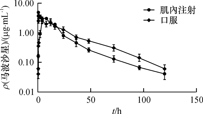 图 1 罗非鱼肌内注射和口服10 mg·kg-1马波沙星后血浆中的药-时曲线 Figure 1 The plasma drug concentration-time curve in tilapia following a single intramuscular or oral administration of 10 mg·kg-1 marbofloxacin |