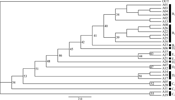 1.2.2 特有性简约分析特有性简约分析(Parsimony analysis of endemicity, PAE)是生物地理学研究中普遍采用的方法,用于生物地理格局及其特有性分析。该方法对划定区域的大小和形状没有特殊的要求,且区域的大小和外形不会影响其分析结果[12]。本研究根据28个区域(图 1)中的物种数,采用特有性简约分析方法对其分布格局进行分析。利用PAUP4.0[13]构建简约树(Maximum parsimony, MP),进行自展检验[14],并以重复1 000次抽样的自展检验值(Bootstrap proportion, BP)来评估其分支的稳定性。