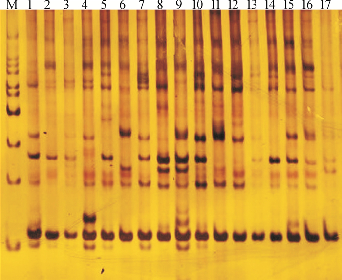 图 1 各种源任豆SRAP引物扩增结果 Figure 1 Amplified results of SRAP primers M:100 bp DNA ladder;任豆种源分别为1:广西靖西;2:广西都安;3:广西罗城;4:广西桂林;5:广东阳山;6:湖南江华;7:广西灵川;8:湖南通道;9:广西德保;10:广西平果;11:广西那坡;12:贵州册亨;13:云南西畴;14:云南麻栗坡;15:贵州梵净山;16:贵州罗甸;17:广东乐昌。 |