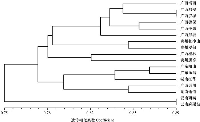 2.4 任豆种源聚类分析根据Nei[8]的遗传距离,采用UPGMA聚类分析,绘制任豆种源遗传关系聚类图(图 2)。以遗传一致度为0.78为界,可以将17个种源分为3大类。第1类来自广西、贵州,包含有广西靖西、都安、罗城等种源和贵州罗甸、梵净山、册亨种源;第2类来自广东、湖南和广西,包括广东阳山、乐昌种源,湖南江华和通道种源,以及广西灵川种源;第3类仅来自云南,包括云南西畴和麻栗坡种源。从聚类结果可以看出,地理距离相近的种源几乎都聚在了同一类群。