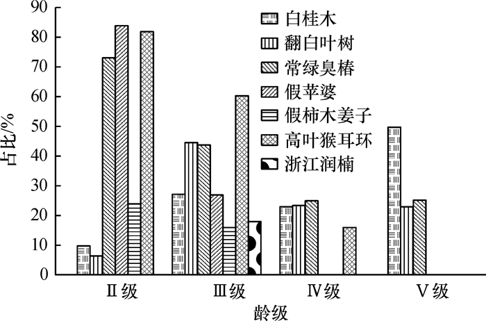 在内伶仃岛白桂木群落中选取乔木层中重要值较大的浙江润楠、亮叶猴耳环、假柿木姜子、假苹婆、常绿臭椿、翻白叶树和白桂木7个优势种群进行年龄结构分析(图 1)。由于森林树种幼苗生存率极低,仅靠幼苗多寡难以对种群的未来做出预测,因此分析年龄结构中不包括幼苗[24]。