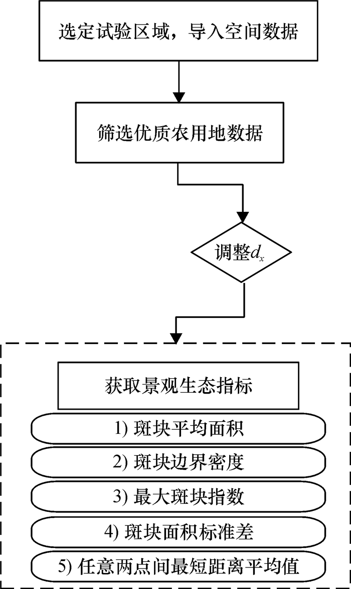 1) 选定dx的范围,读取指标数据。基于景观生态指标的农用地连片距离确定,是指在一个范围内选择出最优的连片阈值。根据实际情况选择dx的变动范围,再由定量化评价模型获取该范围内不同dx的景观生态指标数据。