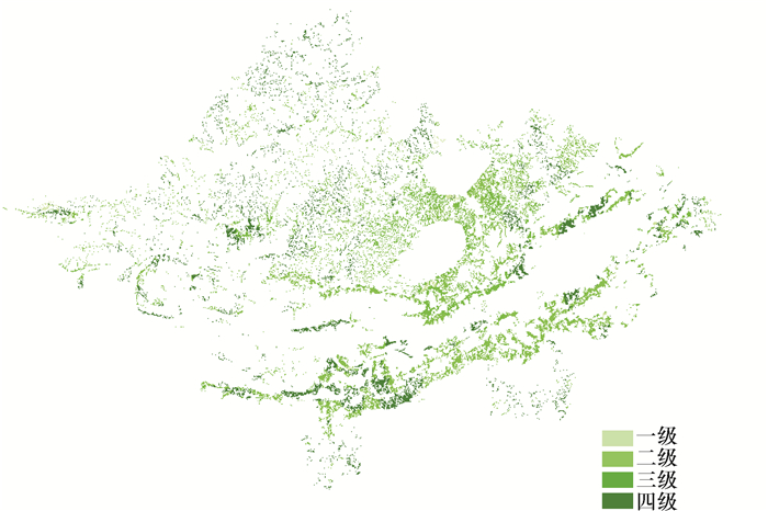 3.1 筛选优质农用地据罗定市2010年耕地质量等级成果年度变更成果中国国家级自然质量等,将罗定市耕地质量分为8个等级。选出质量等级在1~4级之间的农用地块,获得罗定市2010年优质农用地质量分等数据(图 3),可以看出该地区优质农用地主要集中在罗定市的东部以及东南部。