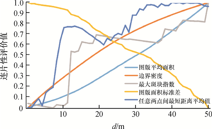 随着d由0~50 m的变化过程,近距离地块之间的连接合并的地块数目呈减少的趋势,全区农用地面积因为边界的缓冲一定程度出现变大趋势,地块面积标准差、最大地块指数的试验数据也变大,任意两点间最短距离平均值指标则呈现变小趋势。当d取50 m时,地块数减少到2 707块,全区农用地面积增加到47 642.4 hm2,最大地块面积2 240.7 hm2,标准差增加到100.39,总周长为8 397.65 km,任意两点间最短距离的平均值43.93 m。