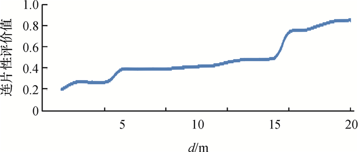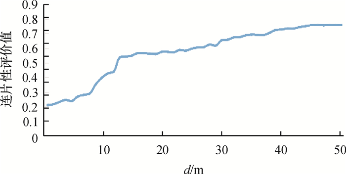 5) 识别d0。经上述4个步骤得到一个拟合的“阈值-连片性评价加权值”关系图,观察曲线的拐点对应的阈值,即可能是最优连片距离d0。
