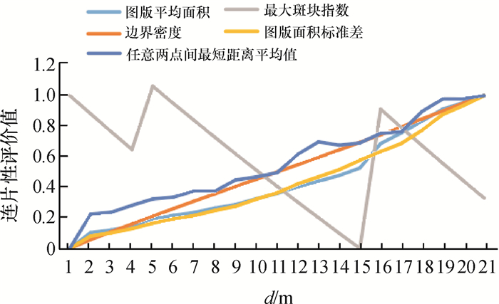 1 基于景观生态指标的连片性评价模型连片性即同一质量范围地块间的相连程度,是一个模糊的概念。为了更好地识别全区连片性随d变化的情况,本研究引入景观生态指标,借助GIS平台的空间数据处理功能获取指标数据,设计基于景观生态指标的定量化连片性评价模型(图 1)。